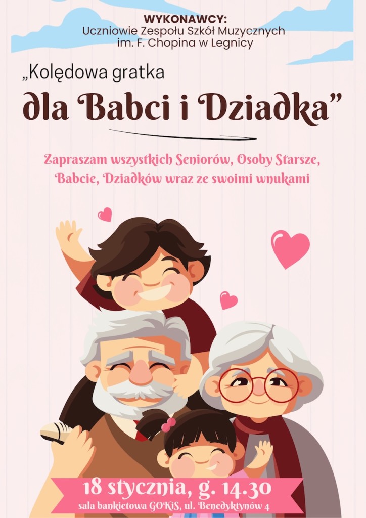 5. W niedzielę (18 stycznia) zapraszam wszystkich Dziadków, Babcie, wszystkich seniorów wraz ze swoimi wnukami na koncert „Kolędowa gratka dla Babci i Dziadka” w wykonaniu uczniów Zespołu Szkół Muzycznych im. F. Chopina w Legnicy przygotowanych przez panią Renetę Piskórz. Rozpoczynamy o godz. 14.30 w Sali bankietowej GOKiSu przy ul. Benedyktnów.