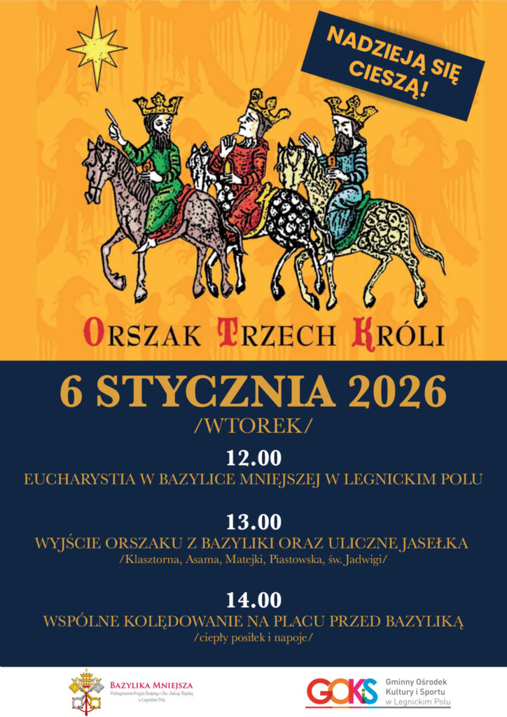 3. We wtorek uroczystość Objawienia Pańskiego, Trzech Króli. Msze święte: 8.30 (Gniewomierz), 10.00 (Mikołajowice) i główna Msza Święta w Legnickim Polu o 12.00. Po każdej Mszy św. odbędzie się obrzęd błogosławienia kredy, kadzidła i wody.