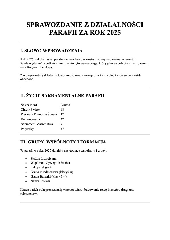 7. W czasie trwania kolędy kancelaria parafialna będzie nieczynna. Wszelkie sprawy można zgłaszać po Mszy Świętej w tygodniu lub umówić się telefonicznie.