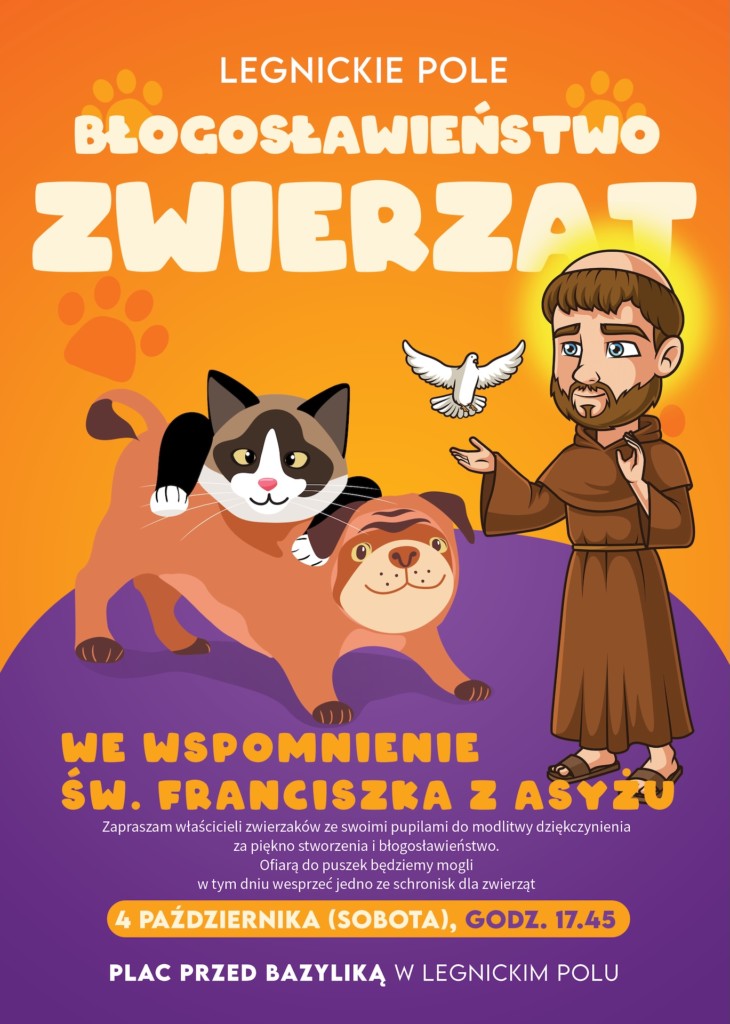 5. Z racji wspomnienia św. Franciszka z Asyżu, które przypada w sobotę o godz. 17.45 odbędzie się obrzęd pobłogosławienia naszych domowych zwierząt. Zapraszam na PLAC PRZED BAZYLIKĄ ze swoimi pupilami. Ofiary składane z tej okazji będą przekazane na rzecz jednego ze schronisk dla zwierząt.
