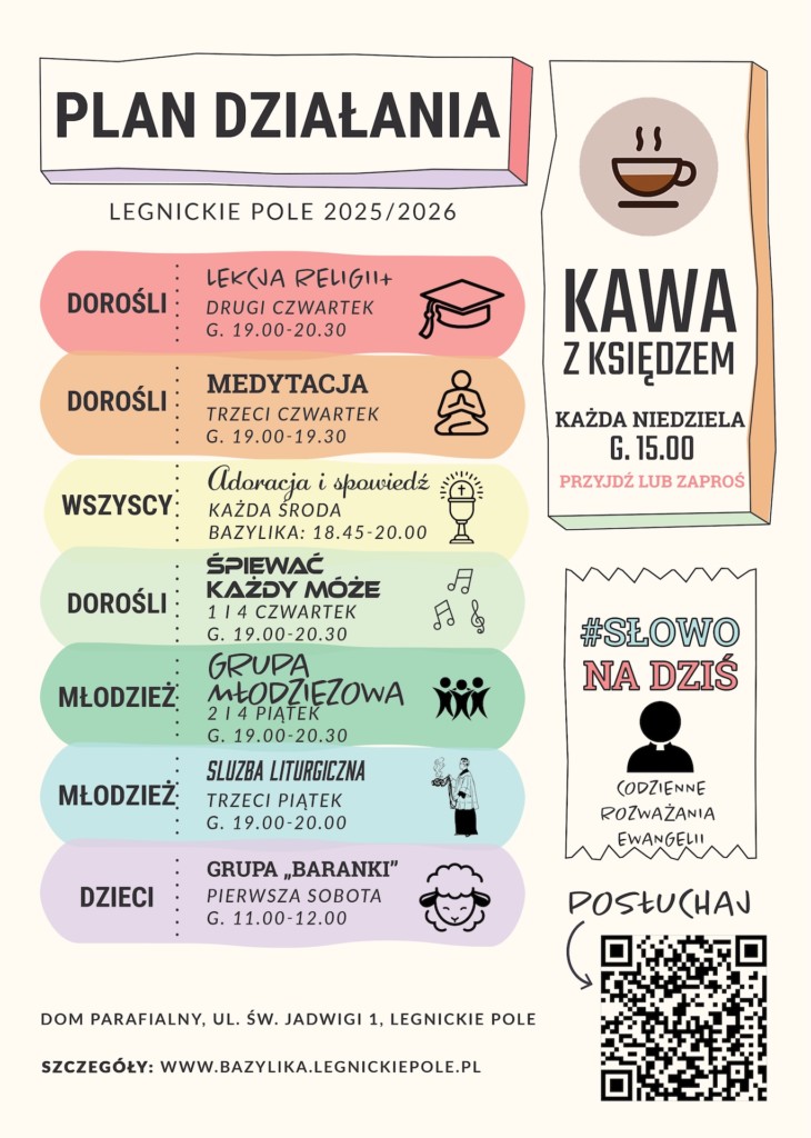– Legnickie Pole: 17.00–18.00 (w kancelarii parafialnej)